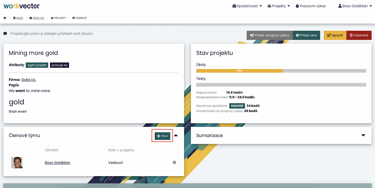 4. Na stránce projektu klikněte v sekci Členové týmu na tlačítko Přidat.