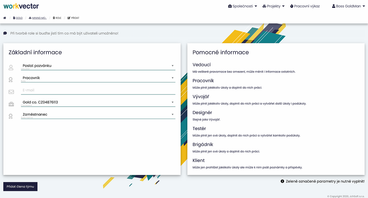Přidávat uživatele do projektu mohou pouze uživatelé, kteří mají v projektu roli Vedoucí.
