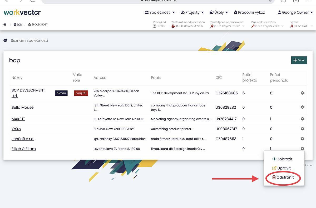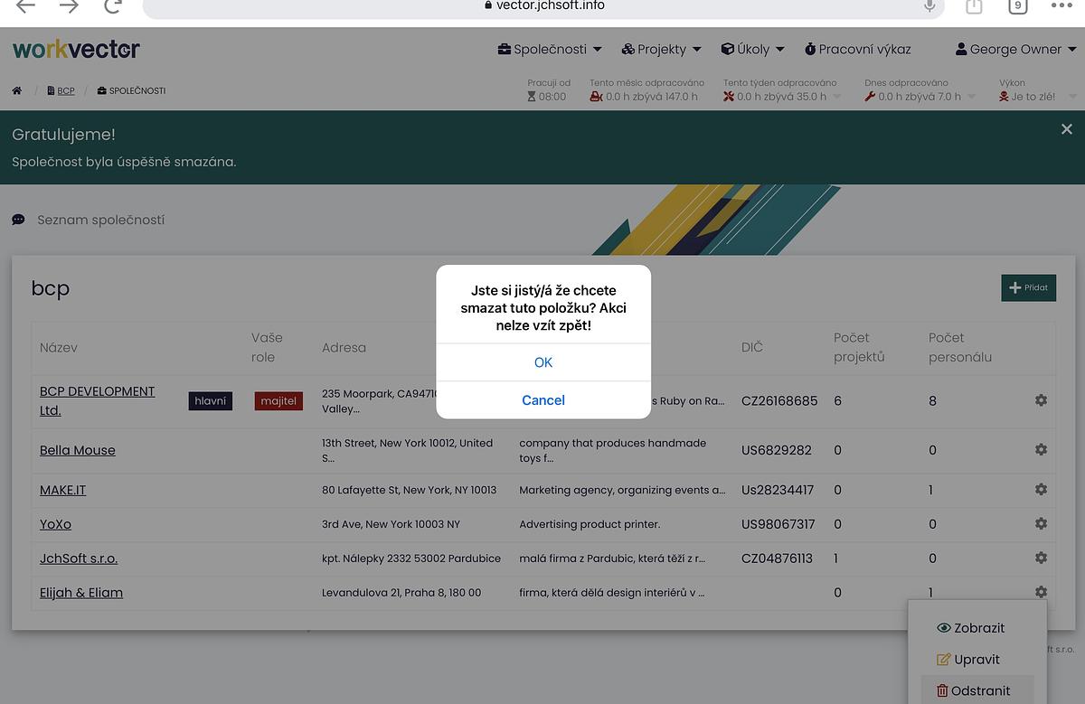 Ak chcete vymazať spoločnosť v systéme WorkVector, tento proces je veľmi jednoduchý. Prejdete na zoznam spoločností, ktorý nájdete na hornej lište. Tu nájdete zoznam všetkých spoločností. Najjednoduchšie to urobíte tak, že kliknete na koliesko v pravom rohu spoločnosti a zobrazí sa ponuka Zobraziť, Upraviť, Odstrániť. Po kliknutí na odstrániť sa zobrazí okno s otázkou WorkVectoru, či ste si týmto rozhodnutím istí, pretože spoločnosť nemôžete znovu vytvoriť, iba ju znovu vytvoriť. Kliknutím na tlačidlo Ok sa spoločnosť odstráni.