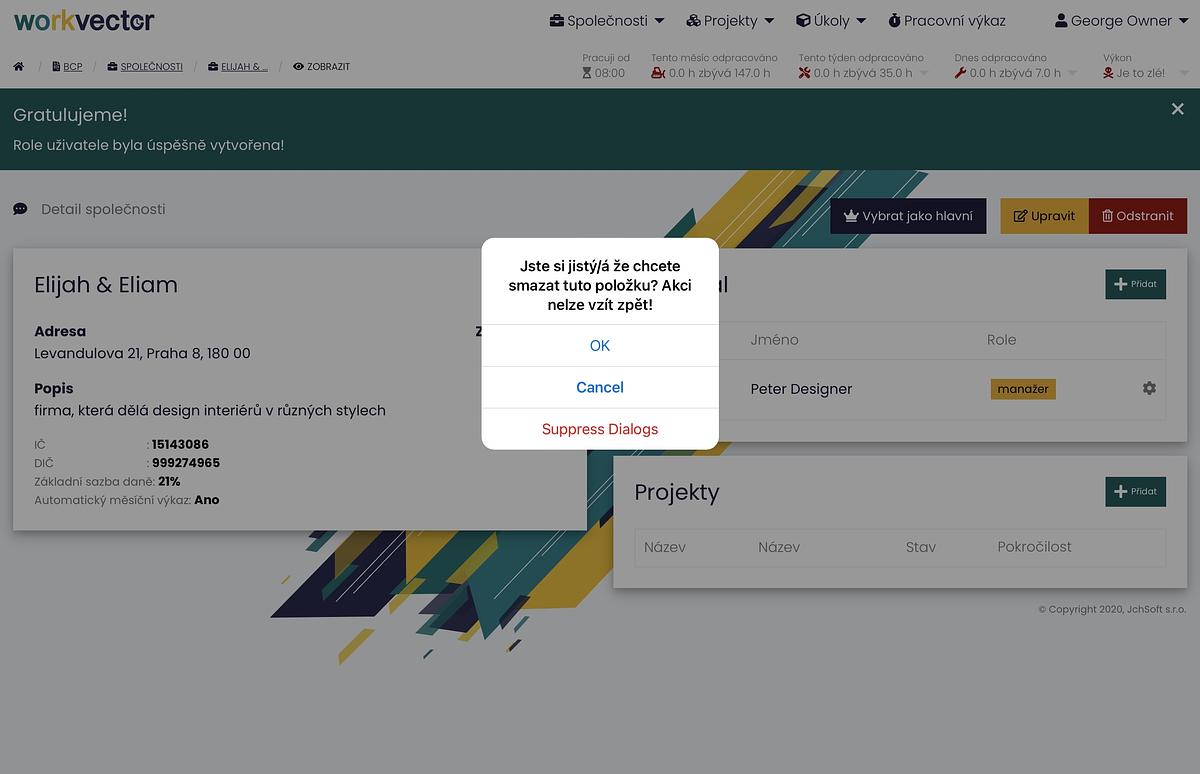 Druhý spôsob odstránenia spoločnosti je zrušiť kliknutie na ňu, čím sa dostanete do Podrobnosti o spoločnosti. Tu si môžete pozrieť všetky jej informácie, projekty a zamestnancov. V pravom hornom rohu sa nachádza tlačidlo odstrániť, ktoré umožňuje odstrániť celú spoločnosť. Po kliknutí na tlačidlo Odstrániť sa zobrazí aj okno s otázkou WorkVector, či ste si týmto rozhodnutím istí, pretože sa bude naďalej vracať. Po udelení súhlasu sa spoločnosť okamžite vymaže a vy môžete pokračovať v sledovaní času a práce.