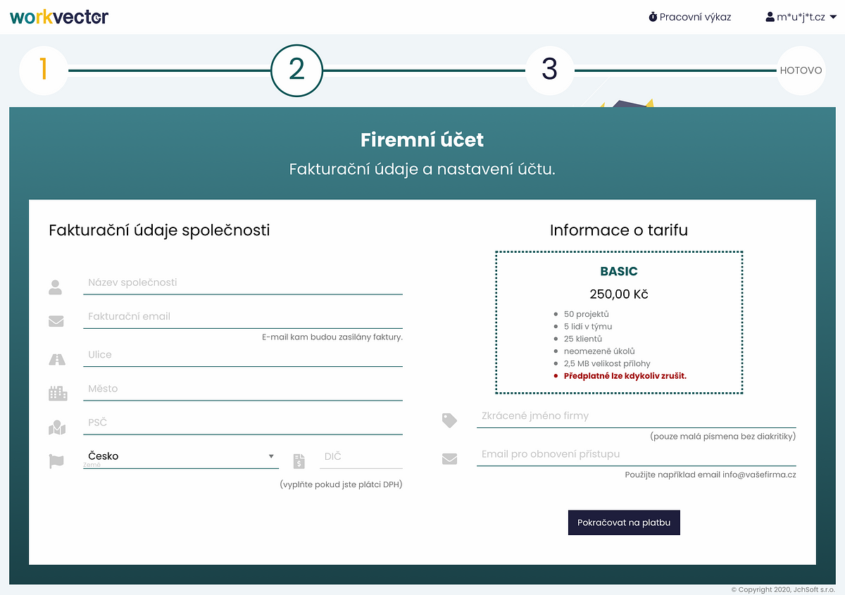 Po vyplnení formulára kliknite na tlačidlo Pokračovať v platbe. Ak ste si vybrali bezplatnú tarifu, automaticky sa pre vás vytvorí hlavná spoločnosť s údajmi zadanými vo fakturačnom formulári.